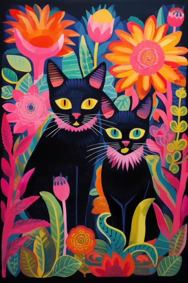 Poster Zwei schwarze Katzen zwischen bunten Blumen Nr f47299
