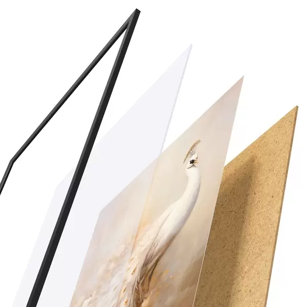 Das Poster besteht aus einem Rahmen, Plexiglas, einem gedruckten Bild und einer Rückwand aus Spanplatten. Dank der Halterungen auf der Rückseite kann das Poster sofort an die Wand gehängt werden.