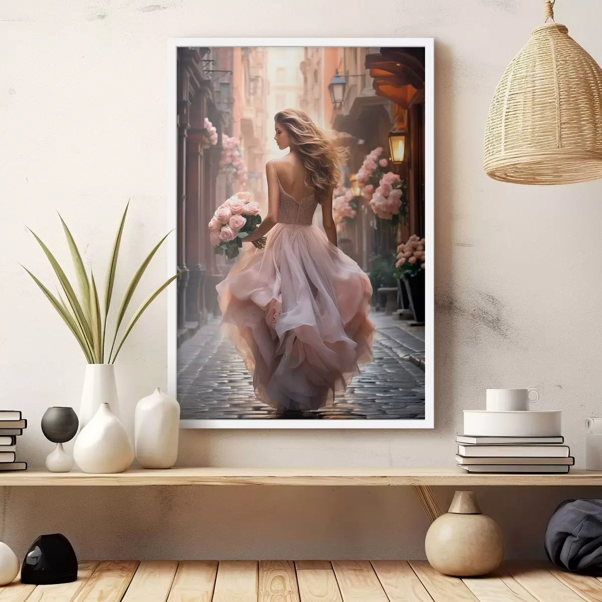 Poster Frau in einem rosa Kleid, die eine Straße entlanggeht Nr f47316