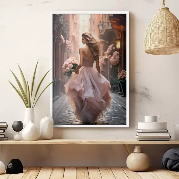 Poster Frau in einem rosa Kleid, die eine Straße entlanggeht f47316