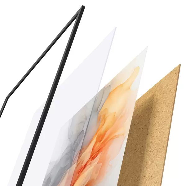 Das Poster besteht aus einem Rahmen, Plexiglas, einem gedruckten Bild und einer Rückwand aus Spanplatten. Dank der Halterungen auf der Rückseite kann das Poster sofort an die Wand gehängt werden.