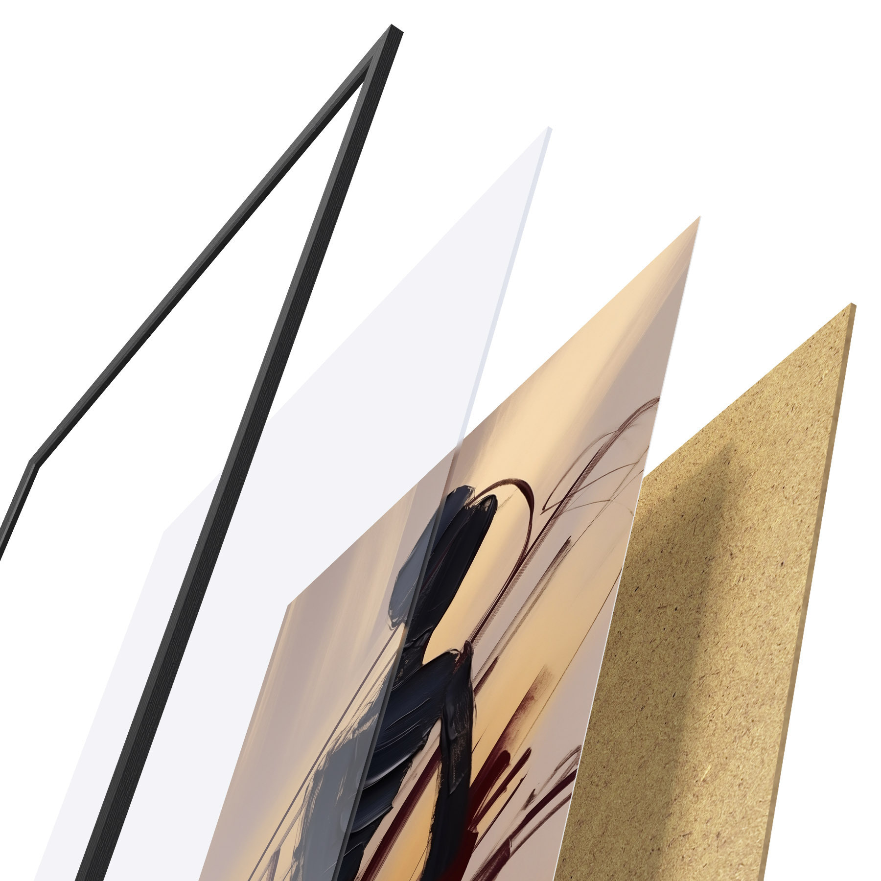 Das Poster besteht aus einem Rahmen, Plexiglas, einem gedruckten Bild und einer Rückwand aus Spanplatten. Dank der Halterungen auf der Rückseite kann das Poster sofort an die Wand gehängt werden.