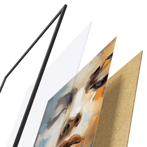 Das Poster besteht aus einem Rahmen, Plexiglas, einem gedruckten Bild und einer Rückwand aus Spanplatten. Dank der Halterungen auf der Rückseite kann das Poster sofort an die Wand gehängt werden.