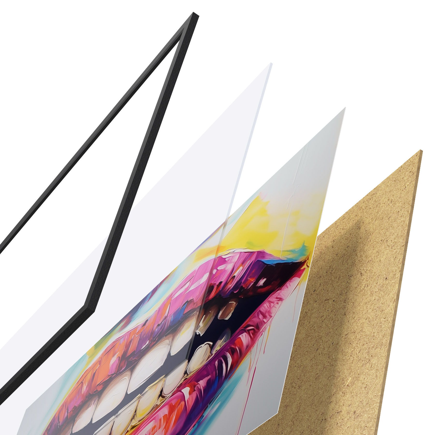 Das Poster besteht aus einem Rahmen, Plexiglas, einem gedruckten Bild und einer Rückwand aus Spanplatten. Dank der Halterungen auf der Rückseite kann das Poster sofort an die Wand gehängt werden.