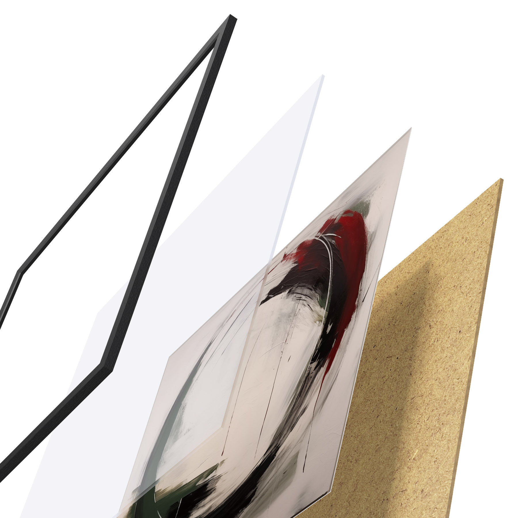 Das Poster besteht aus einem Rahmen, Plexiglas, einem gedruckten Bild und einer Rückwand aus Spanplatten. Dank der Halterungen auf der Rückseite kann das Poster sofort an die Wand gehängt werden.