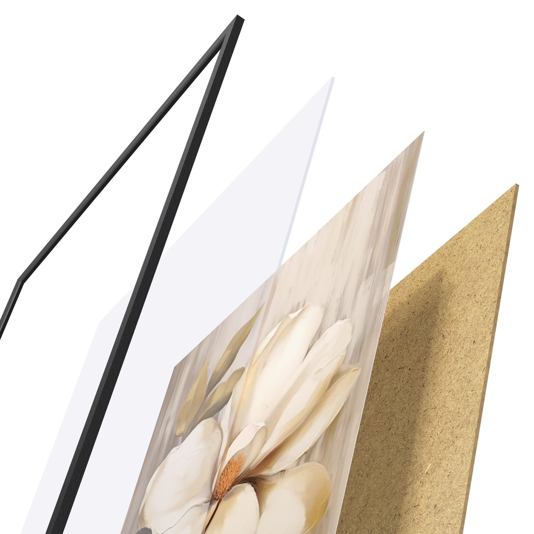 Das Poster besteht aus einem Rahmen, Plexiglas, einem gedruckten Bild und einer Rückwand aus Spanplatten. Dank der Halterungen auf der Rückseite kann das Poster sofort an die Wand gehängt werden.