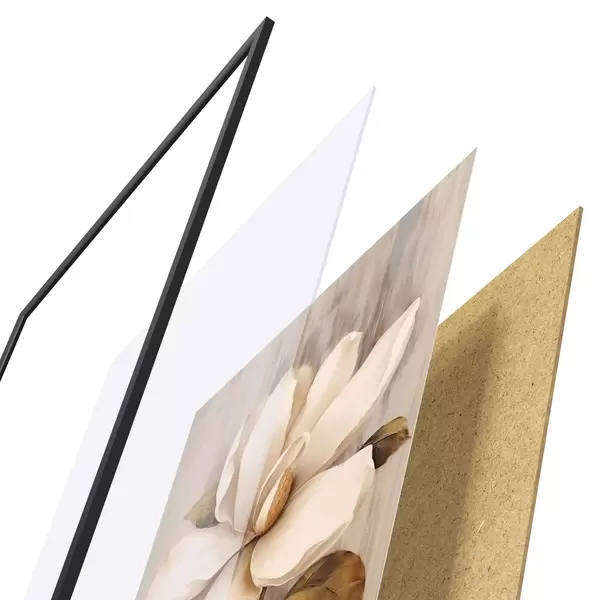 Das Poster besteht aus einem Rahmen, Plexiglas, einem gedruckten Bild und einer Rückwand aus Spanplatten. Dank der Halterungen auf der Rückseite kann das Poster sofort an die Wand gehängt werden.