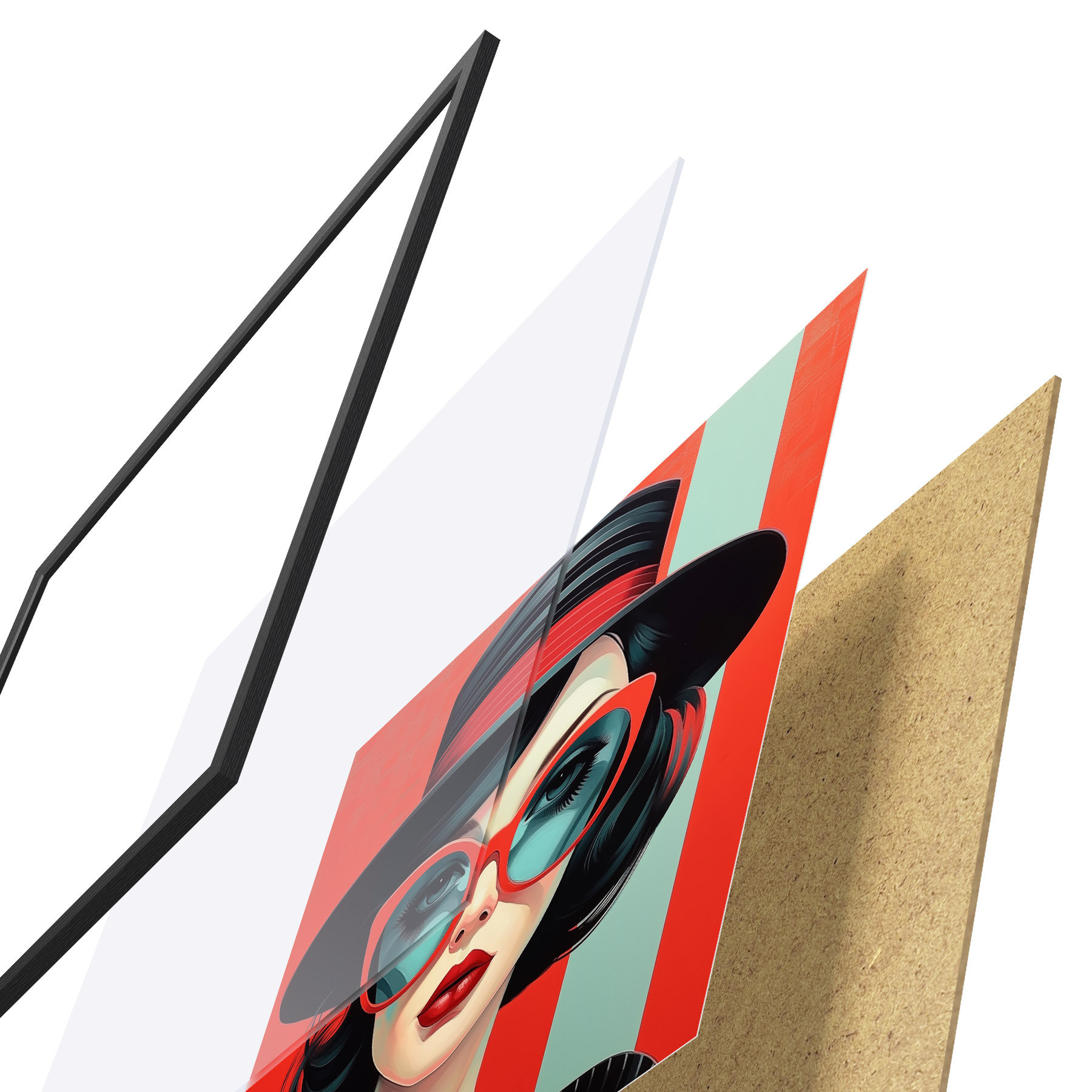 Das Poster besteht aus einem Rahmen, Plexiglas, einem gedruckten Bild und einer Rückwand aus Spanplatten. Dank der Halterungen auf der Rückseite kann das Poster sofort an die Wand gehängt werden.