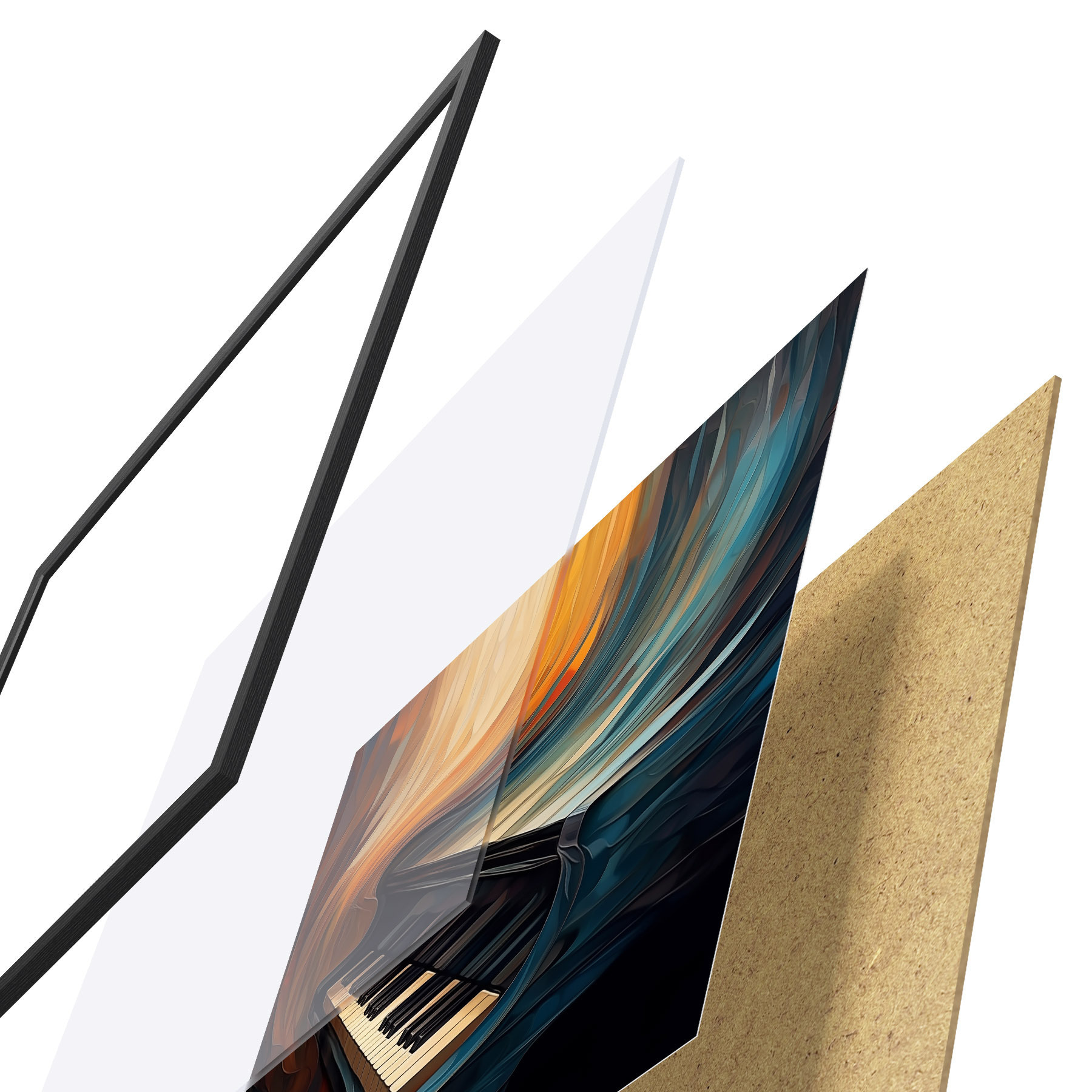 Das Poster besteht aus einem Rahmen, Plexiglas, einem gedruckten Bild und einer Rückwand aus Spanplatten. Dank der Halterungen auf der Rückseite kann das Poster sofort an die Wand gehängt werden.