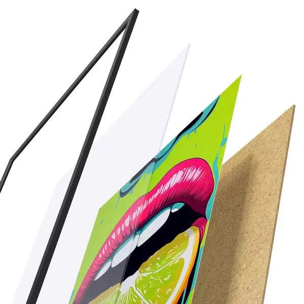 Das Poster besteht aus einem Rahmen, Plexiglas, einem gedruckten Bild und einer Rückwand aus Spanplatten. Dank der Halterungen auf der Rückseite kann das Poster sofort an die Wand gehängt werden.
