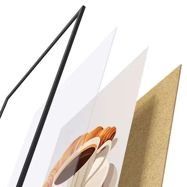 Das Poster besteht aus einem Rahmen, Plexiglas, einem gedruckten Bild und einer Rückwand aus Spanplatten. Dank der Halterungen auf der Rückseite kann das Poster sofort an die Wand gehängt werden.