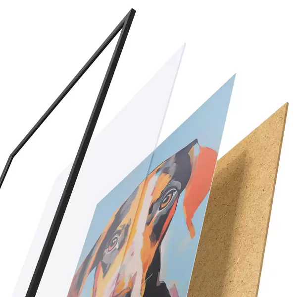 Das Poster besteht aus einem Rahmen, Plexiglas, einem gedruckten Bild und einer Rückwand aus Spanplatten. Dank der Halterungen auf der Rückseite kann das Poster sofort an die Wand gehängt werden.