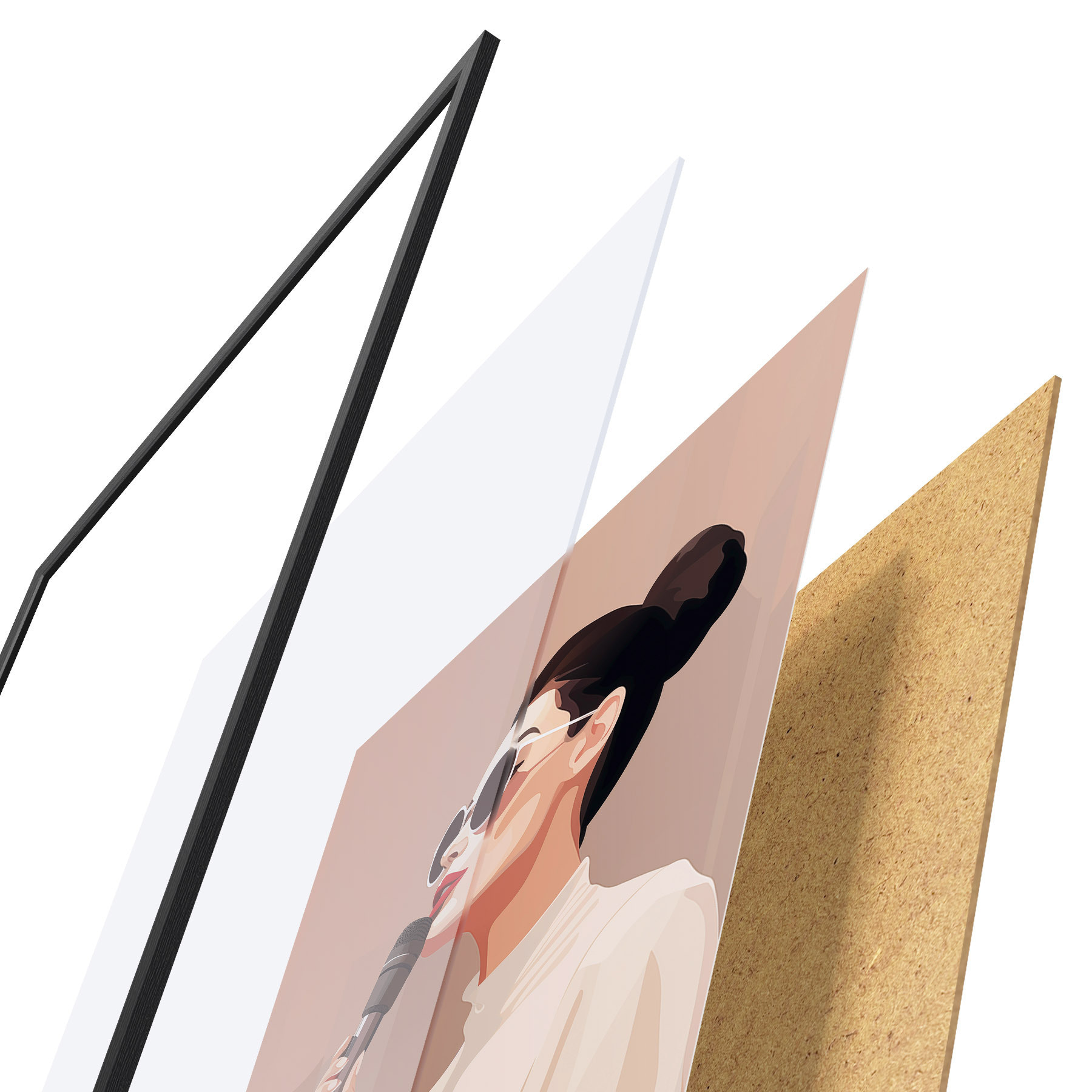 Das Poster besteht aus einem Rahmen, Plexiglas, einem gedruckten Bild und einer Rückwand aus Spanplatten. Dank der Halterungen auf der Rückseite kann das Poster sofort an die Wand gehängt werden.