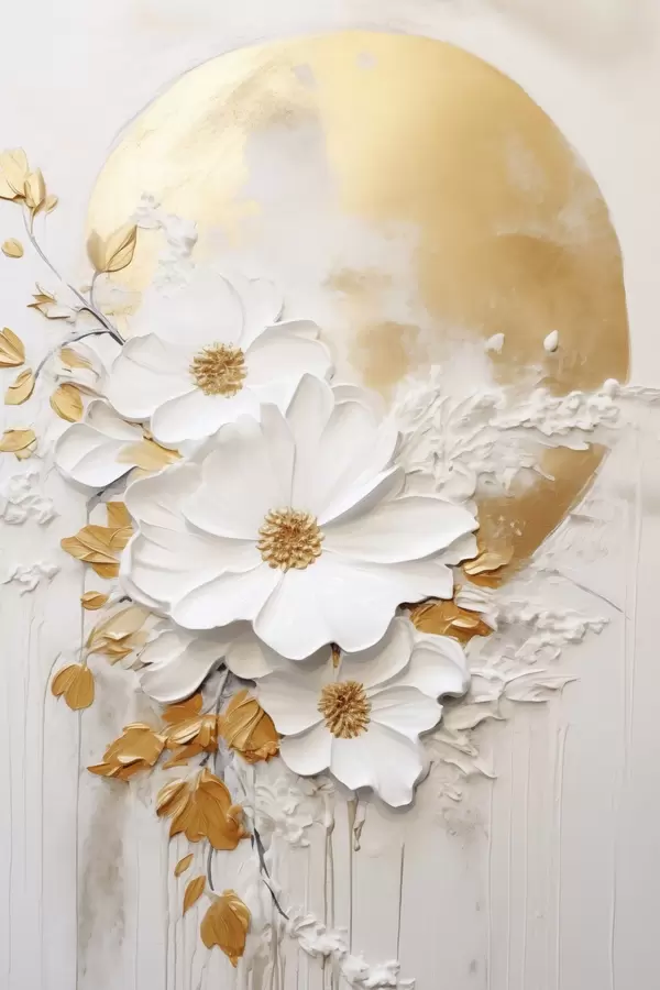 Poster Weiße Blumen mit gelben Akzenten und zarten Blättern vor einem strukturierten Hintergrund, moderne Kunst f47414