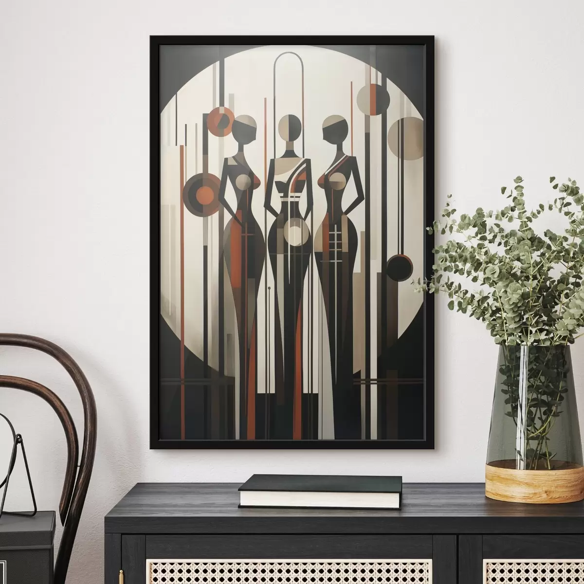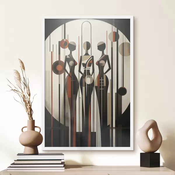 Poster Stilisierte weibliche Figuren mit geometrischen Elementen vor einem abstrakten Hintergrund aus vertikalen Linien und Kreisen Nr f47422