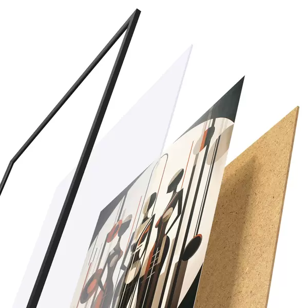 Das Poster besteht aus einem Rahmen, Plexiglas, einem gedruckten Bild und einer Rückwand aus Spanplatten. Dank der Halterungen auf der Rückseite kann das Poster sofort an die Wand gehängt werden.