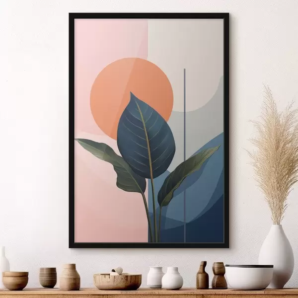 Poster Dunkle Blätter vor einem Hintergrund aus abstrakten Formen in Pfirsich und Grau mit orangefarbenem Kreis Nr f47425