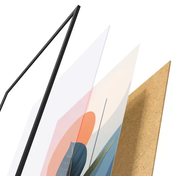 Das Poster besteht aus einem Rahmen, Plexiglas, einem gedruckten Bild und einer Rückwand aus Spanplatten. Dank der Halterungen auf der Rückseite kann das Poster sofort an die Wand gehängt werden.