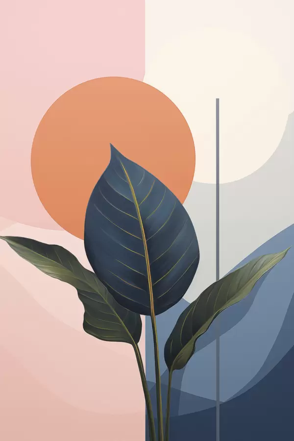 Poster Dunkle Blätter vor einem Hintergrund aus abstrakten Formen in Pfirsich und Grau mit orangefarbenem Kreis Nr f47425