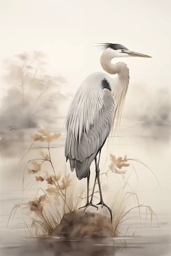 Poster Ein Reiher steht auf einem Felsen in einem See, im Hintergrund hohe Gräser und Bäume. Nr f47426