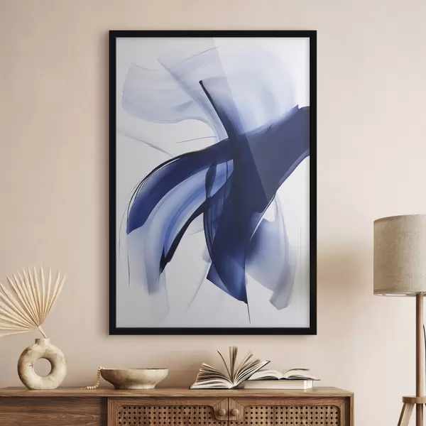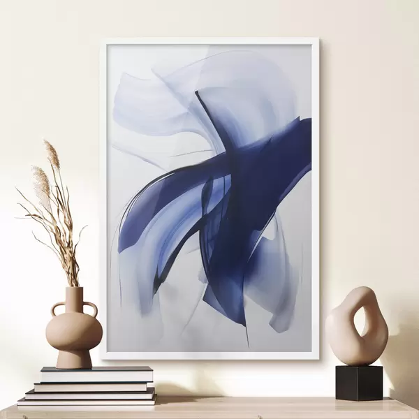 Poster Abstrakte blaue, pinselstrichartige Formen mit fließenden Linien und Kurven vor weißem Hintergrund, moderne Kunst f47429