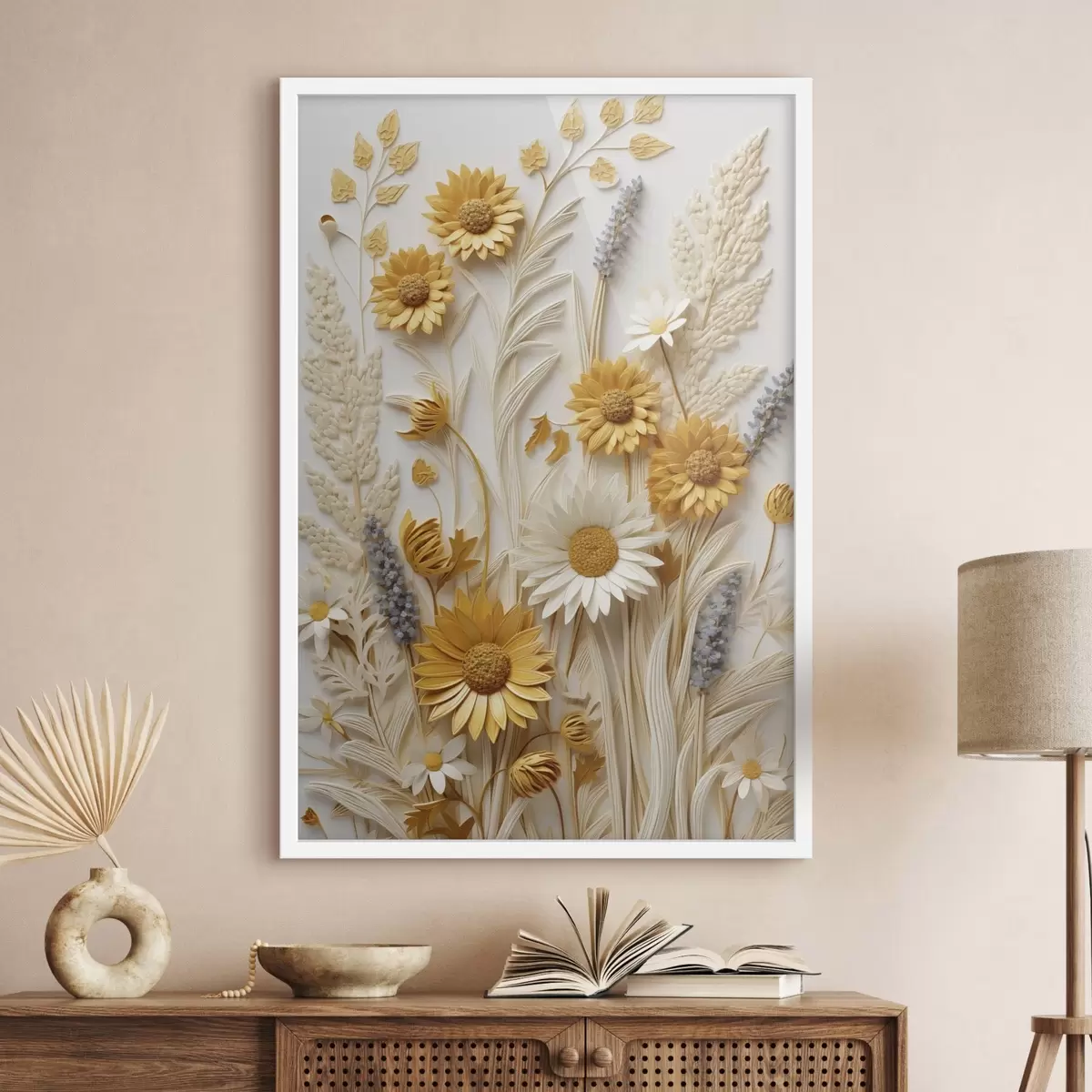 Poster Eine strukturierte Kollektion aus gelben und weißen Gänseblümchen mit getrockneten Gräsern und Lavendelzweigen auf weißem Hintergrund. f47430