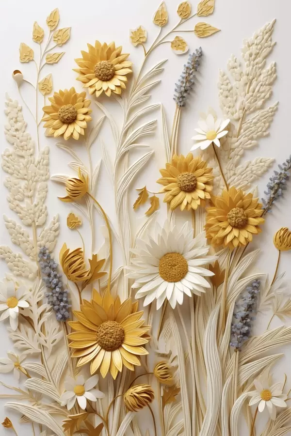 Poster Eine strukturierte Kollektion aus gelben und weißen Gänseblümchen mit getrockneten Gräsern und Lavendelzweigen auf weißem Hintergrund. f47430