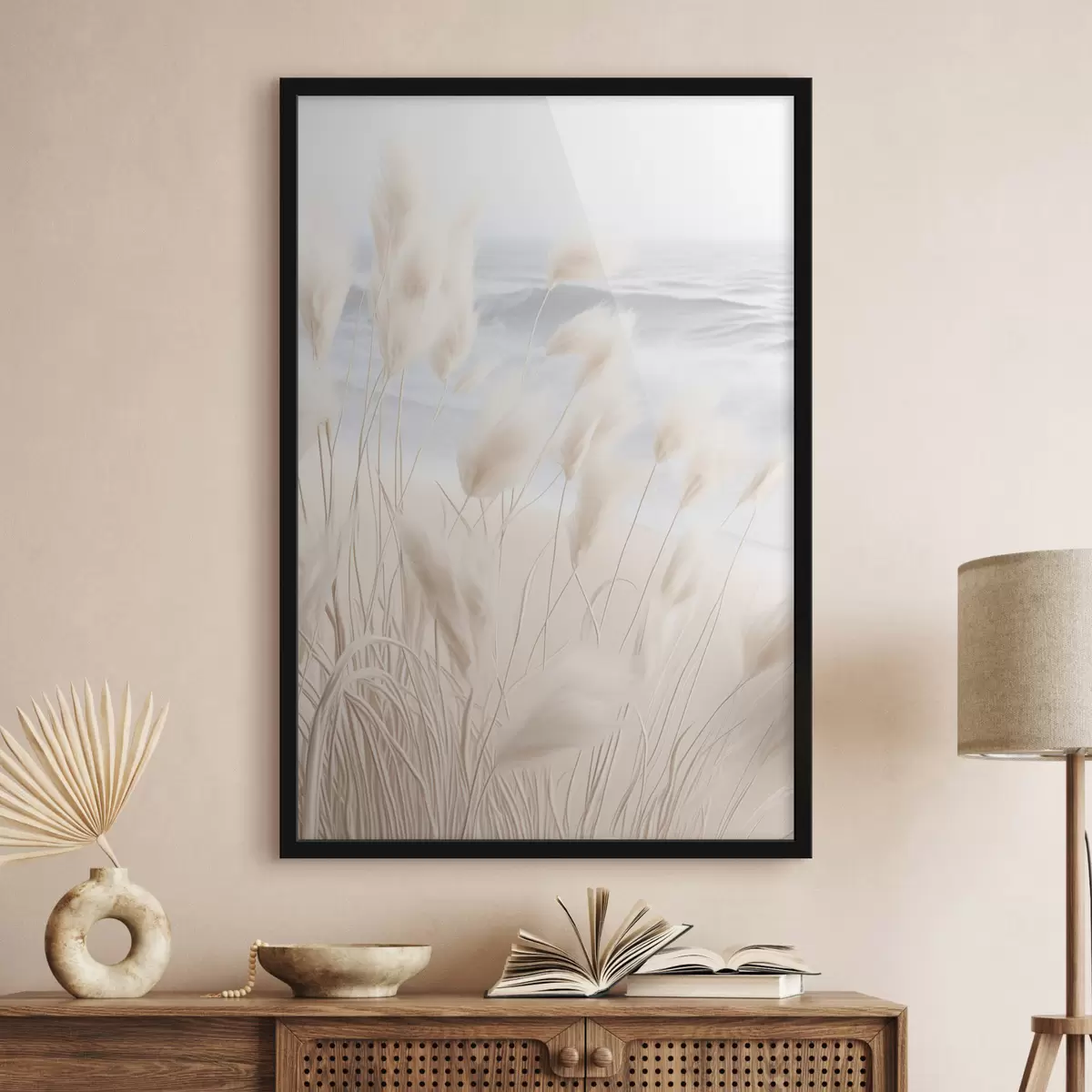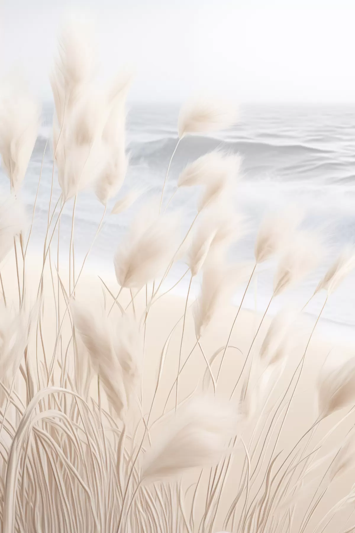 Poster Hohes, federartiges Pampasgras in sanften Beigetönen im Vordergrund, mit einem Sandstrand im Hintergrund Nr f47432