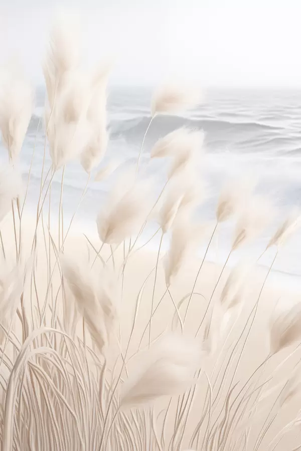 Poster Hohes, federartiges Pampasgras in sanften Beigetönen im Vordergrund, mit einem Sandstrand im Hintergrund Nr f47432