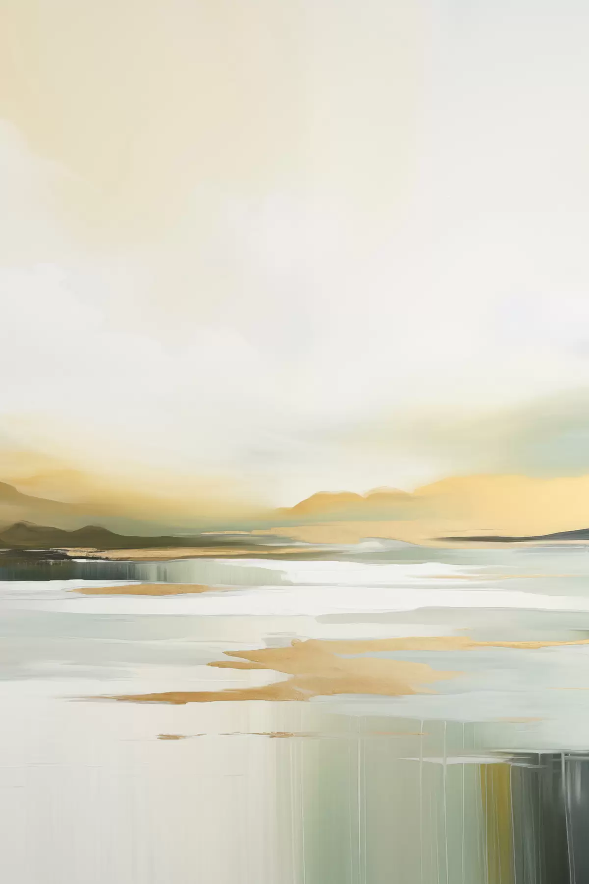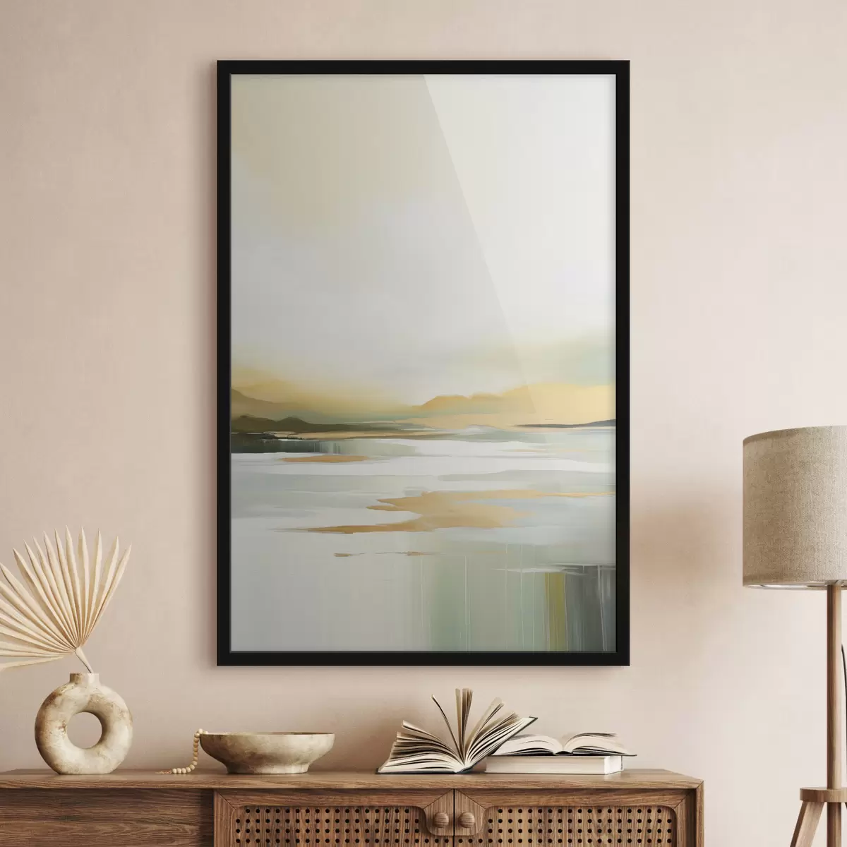 Poster Abstrakte Landschaft mit Gelb- und Grüntönen, Wasser, das den Himmel und entfernte Berge reflektiert, blasser, dunstiger Himmel Nr f47439