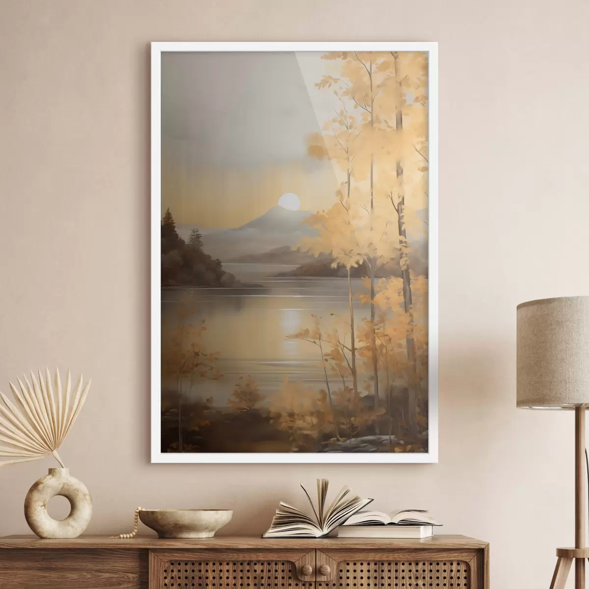 Poster Herbstliche Bäume mit orangefarbenen Blättern umrahmen einen ruhigen See mit fernen Bergen unter einem bewölkten Himmel. f47440