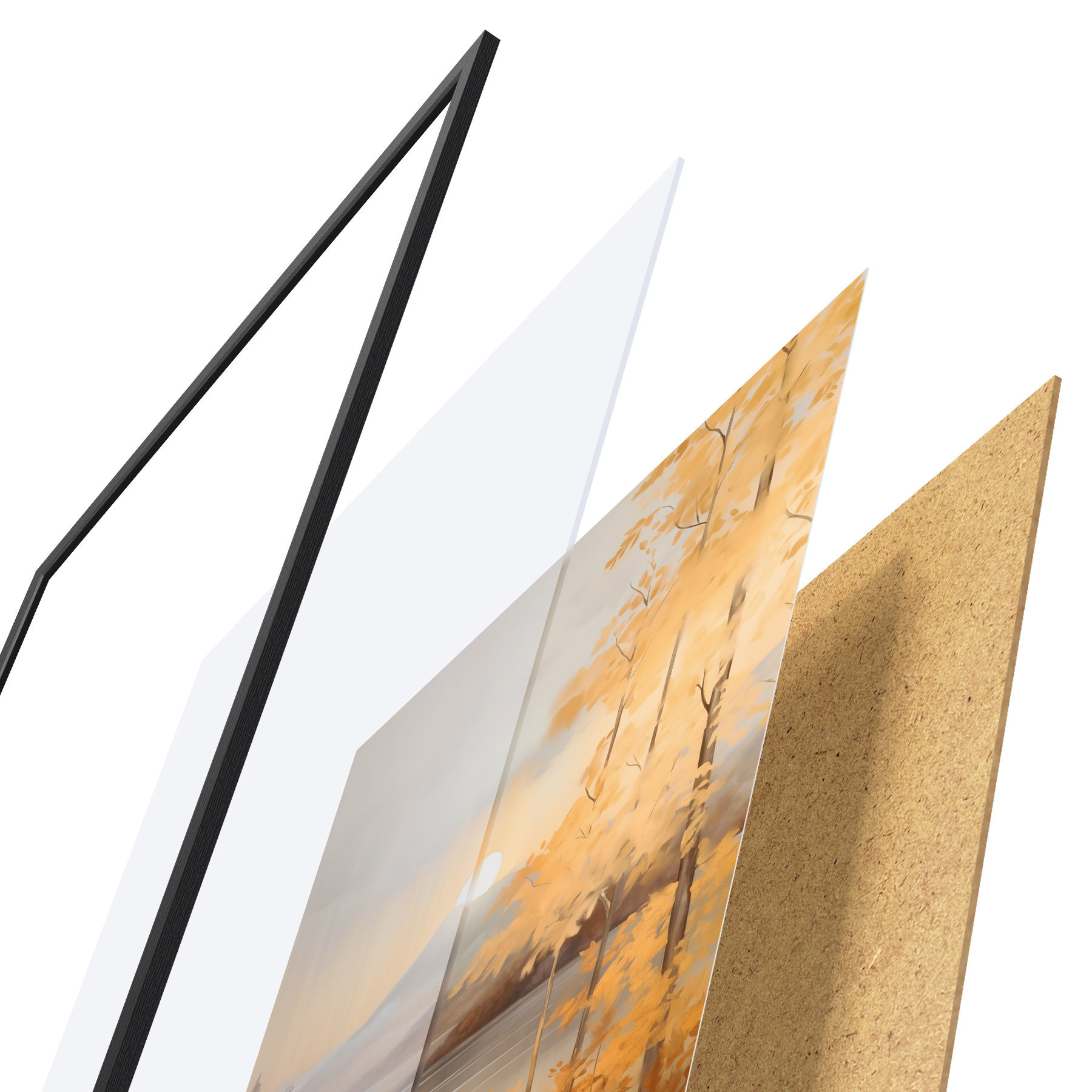 Das Poster besteht aus einem Rahmen, Plexiglas, einem gedruckten Bild und einer Rückwand aus Spanplatten. Dank der Halterungen auf der Rückseite kann das Poster sofort an die Wand gehängt werden.