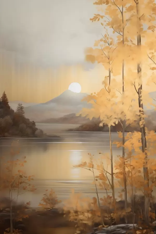 Poster Herbstliche Bäume mit orangefarbenen Blättern umrahmen einen ruhigen See mit fernen Bergen unter einem bewölkten Himmel. Nr f47440