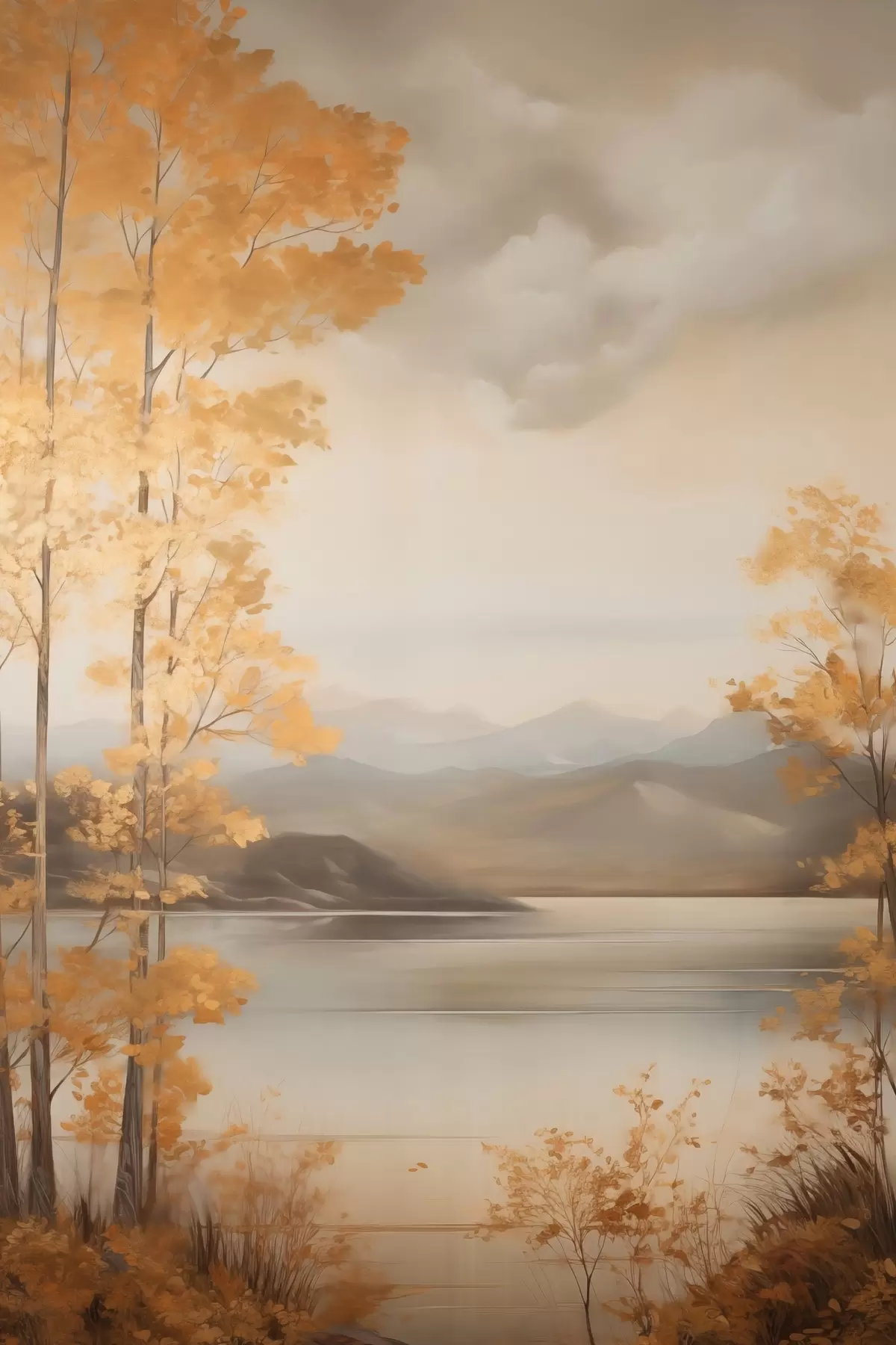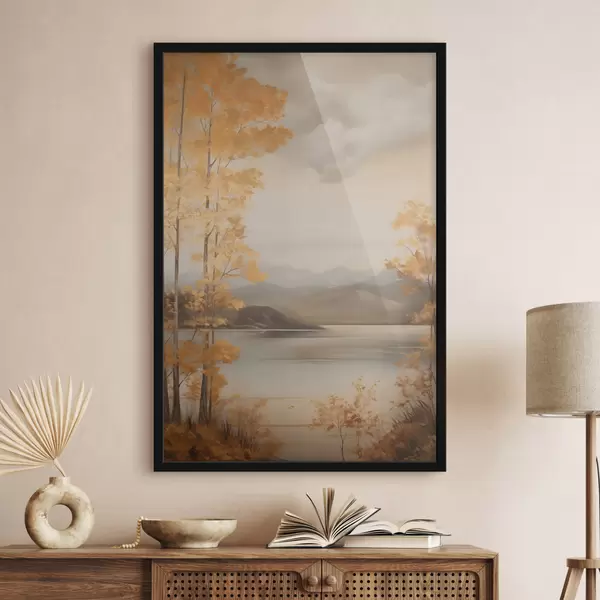 Poster Herbstliche Bäume mit orangefarbenen Blättern umrahmen einen ruhigen See mit fernen Bergen unter einem bewölkten Himmel. f47441