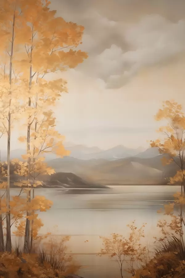 Poster Herbstliche Bäume mit orangefarbenen Blättern umrahmen einen ruhigen See mit fernen Bergen unter einem bewölkten Himmel. f47441