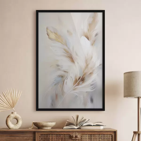 Poster Große, weiche Federn in einer Mischung aus Weiß-, Gelb- und Brauntönen vor einem hellen, abstrakten Hintergrund Nr f47442