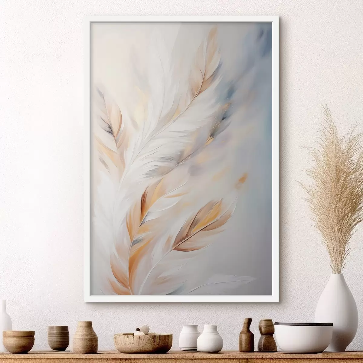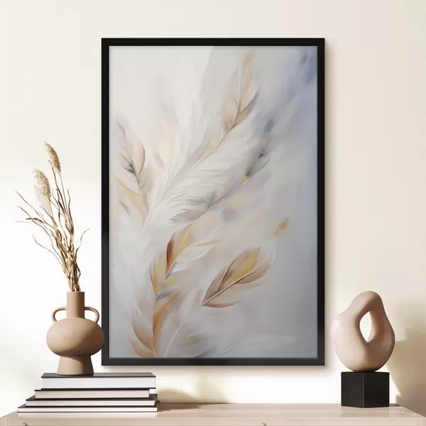 Poster Große, weiche Federn in einer Mischung aus Weiß-, Gelb- und Brauntönen vor einem hellen, abstrakten Hintergrund Nr f47443