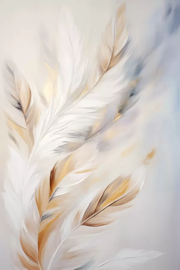 Poster Große, weiche Federn in einer Mischung aus Weiß-, Gelb- und Brauntönen vor einem hellen, abstrakten Hintergrund Nr f47443