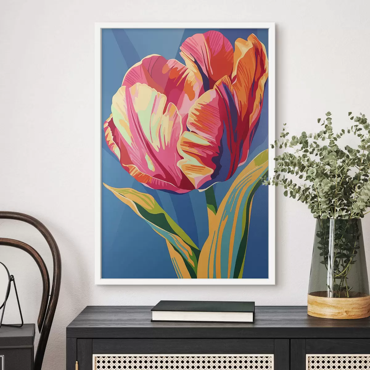 Das Poster besteht aus einem Rahmen, Plexiglas, einem gedruckten Bild und einer Rückwand aus Spanplatten. Dank der Halterungen auf der Rückseite kann das Poster sofort an die Wand gehängt werden.