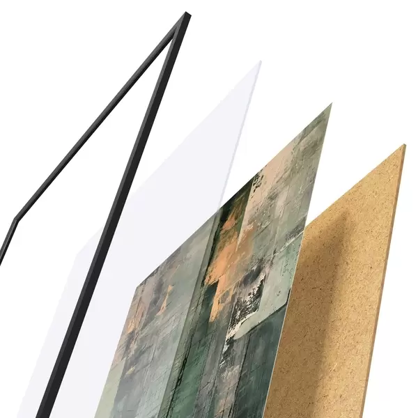 Das Poster besteht aus einem Rahmen, Plexiglas, einem gedruckten Bild und einer Rückwand aus Spanplatten. Dank der Halterungen auf der Rückseite kann das Poster sofort an die Wand gehängt werden.