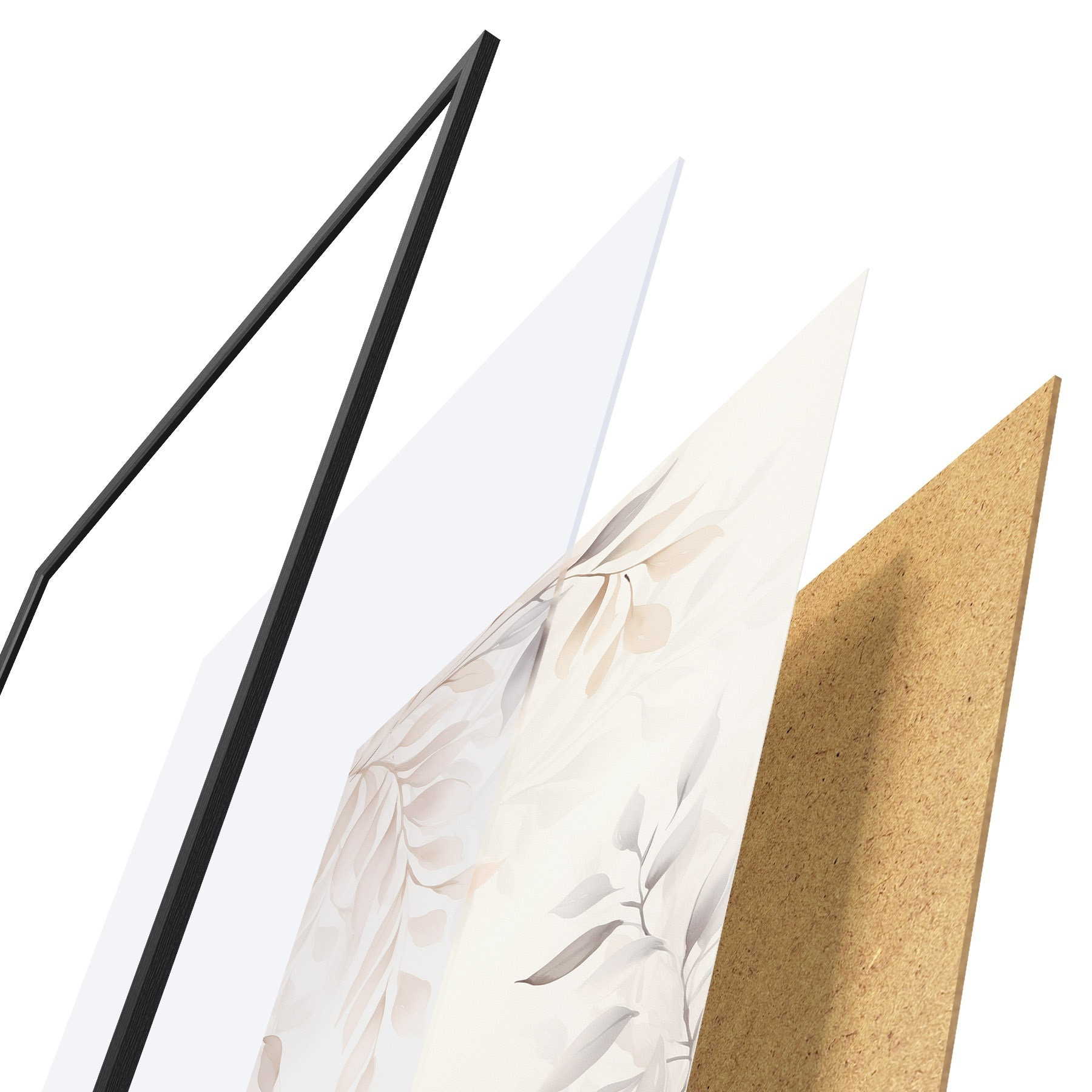 Das Poster besteht aus einem Rahmen, Plexiglas, einem gedruckten Bild und einer Rückwand aus Spanplatten. Dank der Halterungen auf der Rückseite kann das Poster sofort an die Wand gehängt werden.