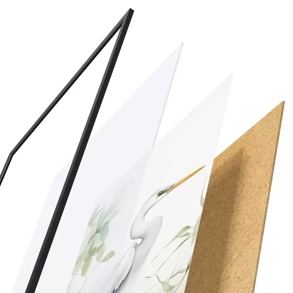 Das Poster besteht aus einem Rahmen, Plexiglas, einem gedruckten Bild und einer Rückwand aus Spanplatten. Dank der Halterungen auf der Rückseite kann das Poster sofort an die Wand gehängt werden.