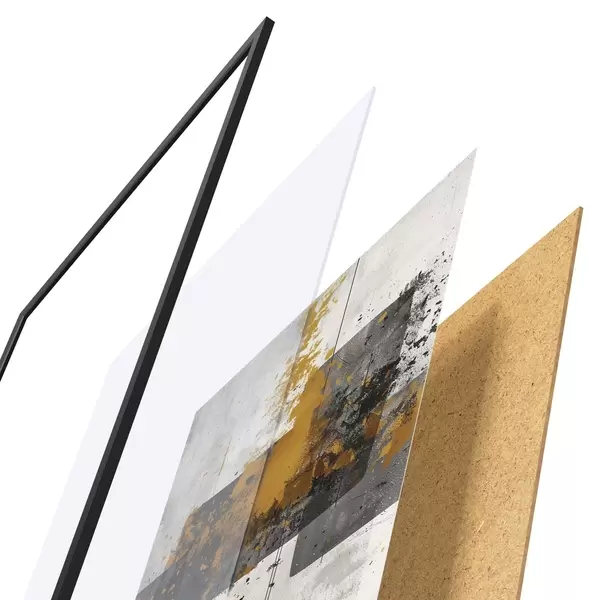 Das Poster besteht aus einem Rahmen, Plexiglas, einem gedruckten Bild und einer Rückwand aus Spanplatten. Dank der Halterungen auf der Rückseite kann das Poster sofort an die Wand gehängt werden.