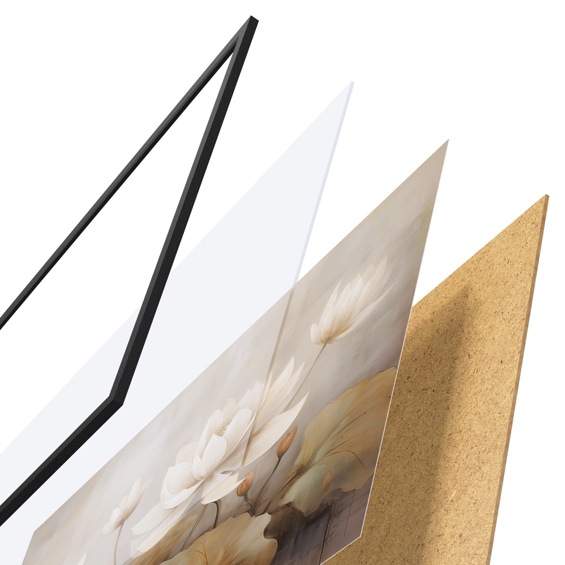 Das Poster besteht aus einem Rahmen, Plexiglas, einem gedruckten Bild und einer Rückwand aus Spanplatten. Dank der Halterungen auf der Rückseite kann das Poster sofort an die Wand gehängt werden.