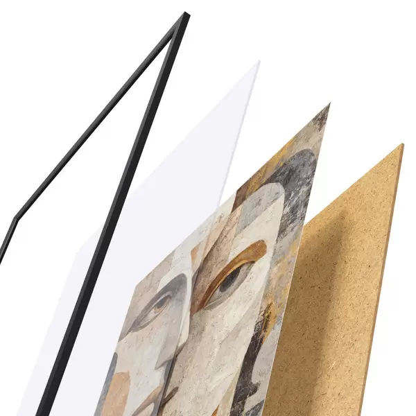 Das Poster besteht aus einem Rahmen, Plexiglas, einem gedruckten Bild und einer Rückwand aus Spanplatten. Dank der Halterungen auf der Rückseite kann das Poster sofort an die Wand gehängt werden.