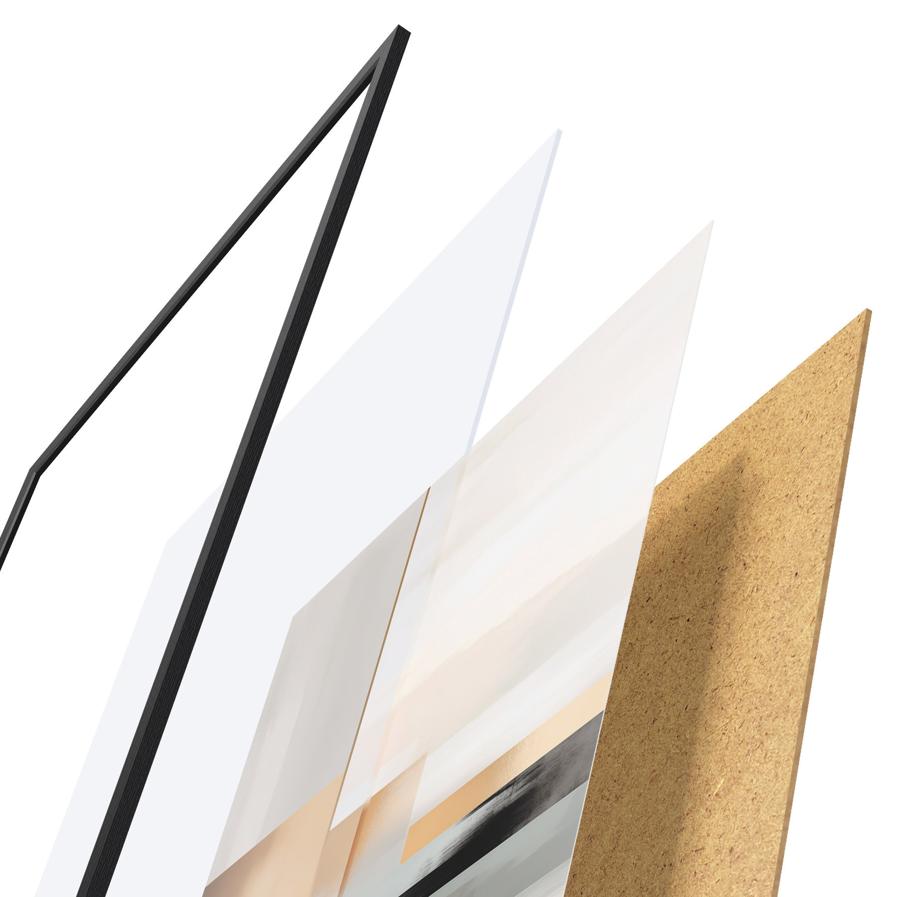 Das Poster besteht aus einem Rahmen, Plexiglas, einem gedruckten Bild und einer Rückwand aus Spanplatten. Dank der Halterungen auf der Rückseite kann das Poster sofort an die Wand gehängt werden.