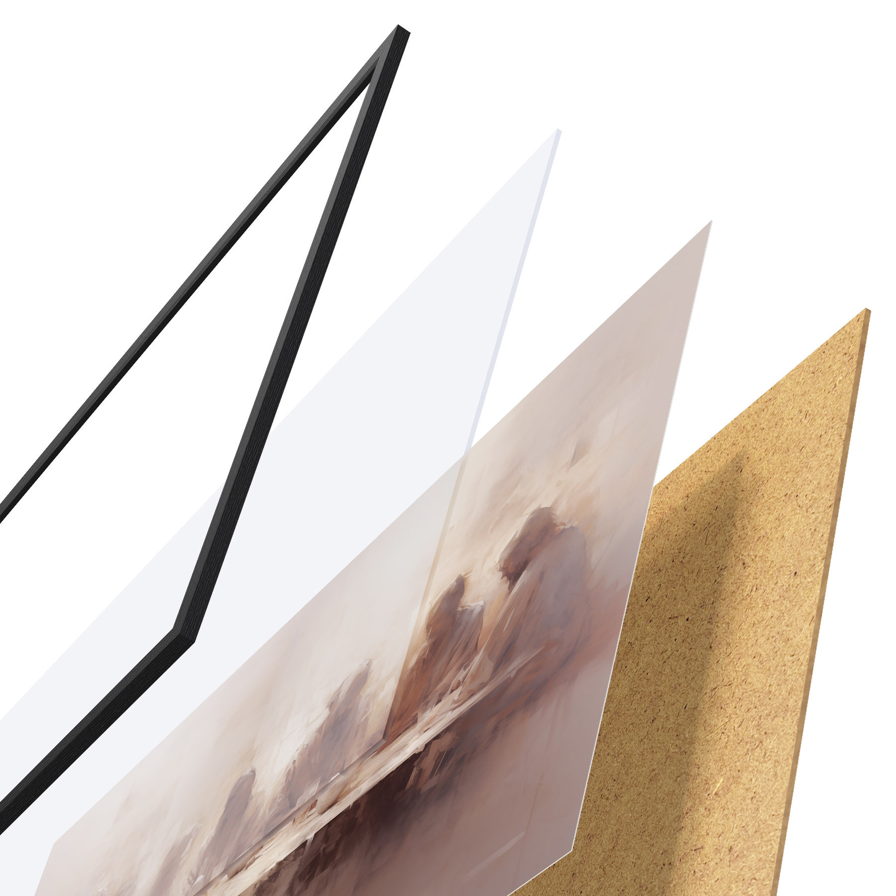 Das Poster besteht aus einem Rahmen, Plexiglas, einem gedruckten Bild und einer Rückwand aus Spanplatten. Dank der Halterungen auf der Rückseite kann das Poster sofort an die Wand gehängt werden.