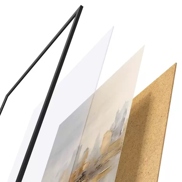Das Poster besteht aus einem Rahmen, Plexiglas, einem gedruckten Bild und einer Rückwand aus Spanplatten. Dank der Halterungen auf der Rückseite kann das Poster sofort an die Wand gehängt werden.