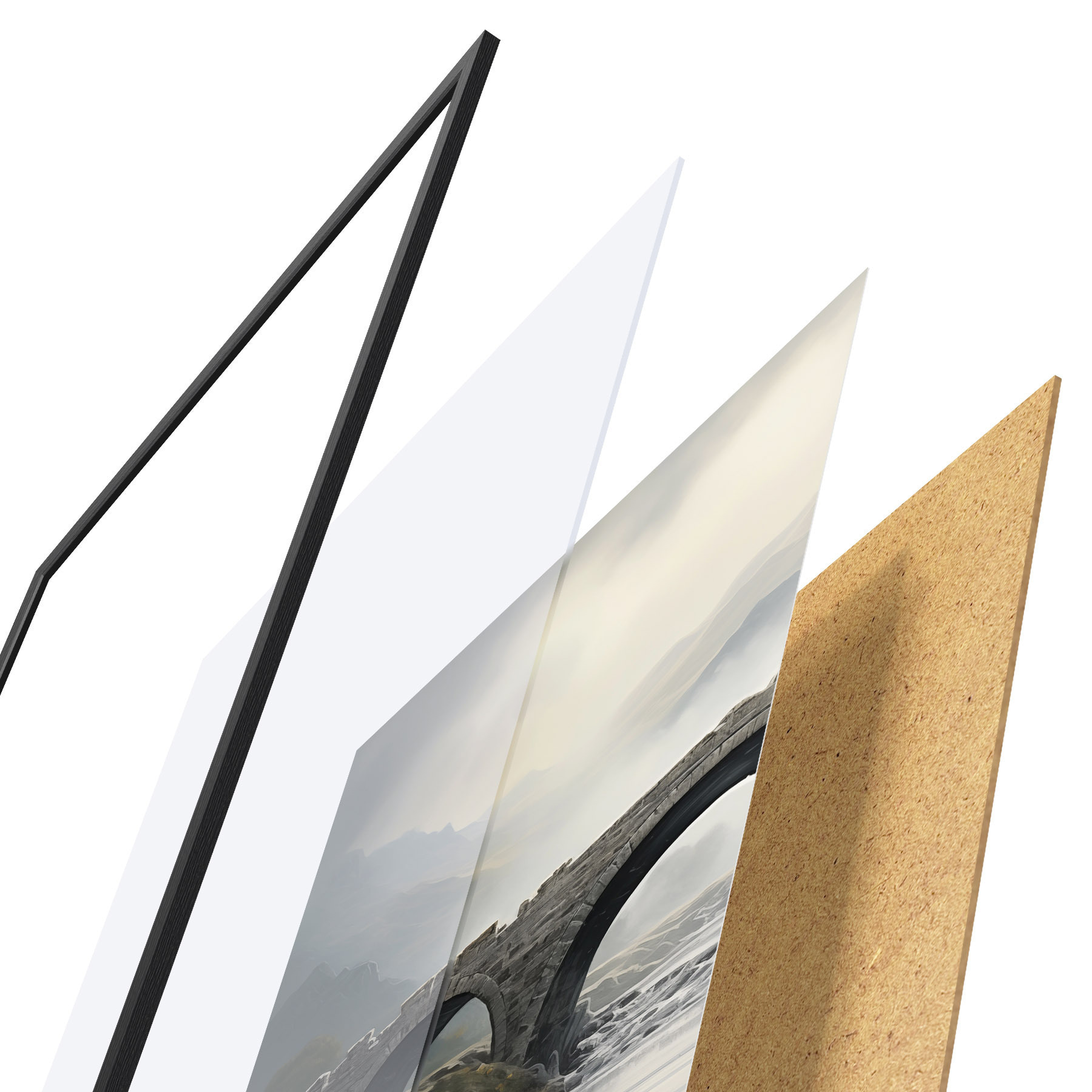 Das Poster besteht aus einem Rahmen, Plexiglas, einem gedruckten Bild und einer Rückwand aus Spanplatten. Dank der Halterungen auf der Rückseite kann das Poster sofort an die Wand gehängt werden.