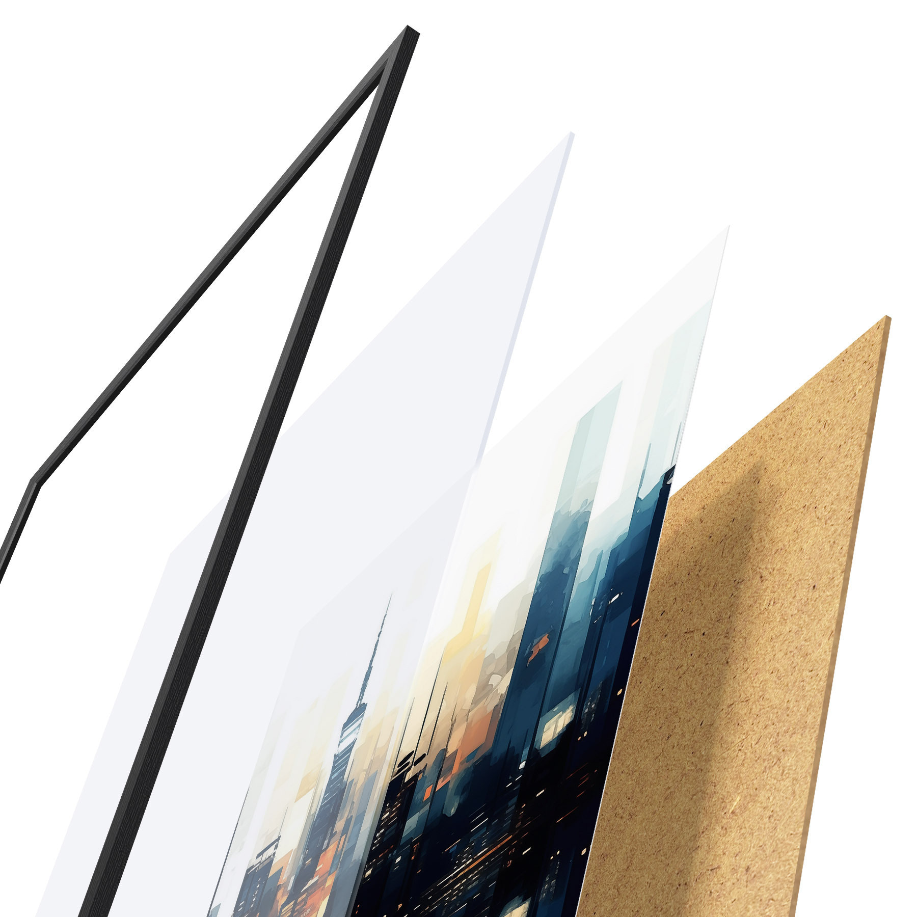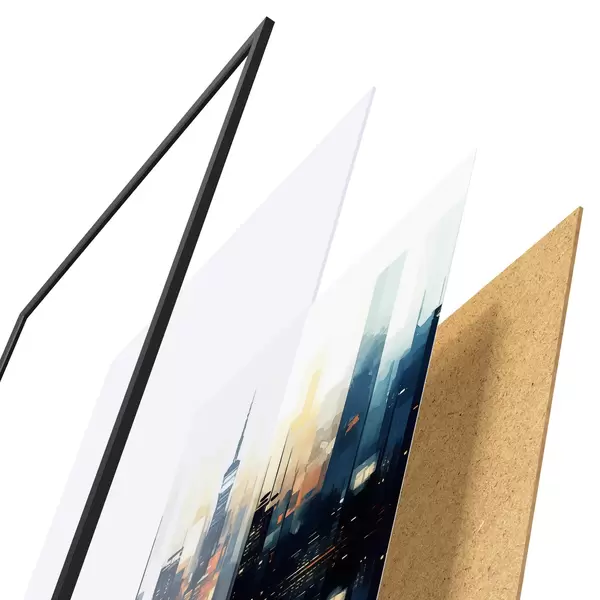 Das Poster besteht aus einem Rahmen, Plexiglas, einem gedruckten Bild und einer Rückwand aus Spanplatten. Dank der Halterungen auf der Rückseite kann das Poster sofort an die Wand gehängt werden.